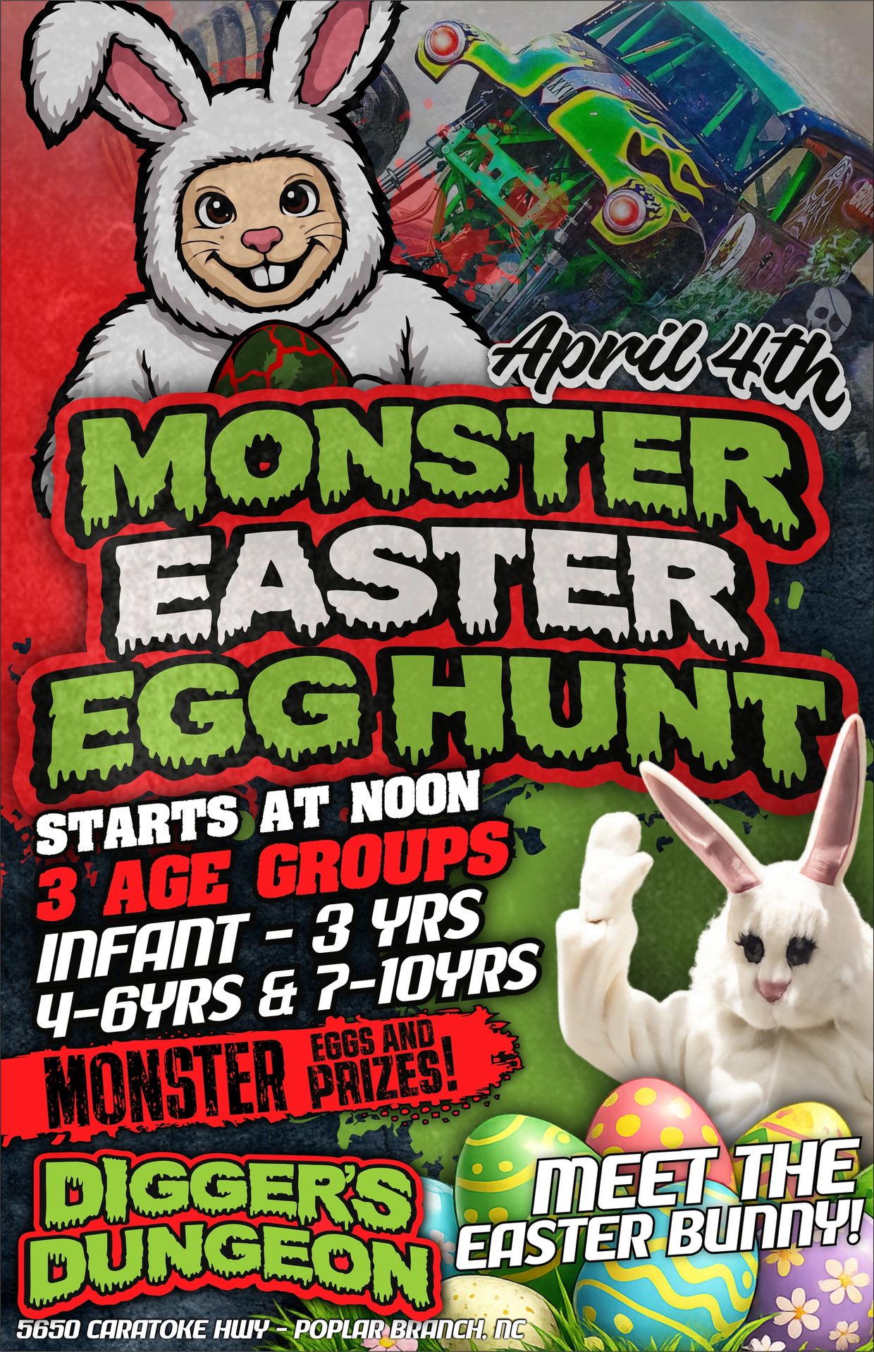 Peter Cottontail will be bouncing around the Grave Digger's Dungeon Compound ALL DAY and will be ready for his photo-op with his biggest fans... YOU!